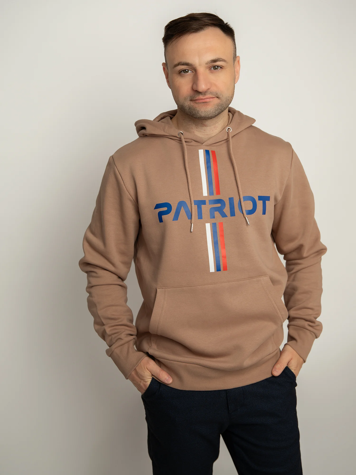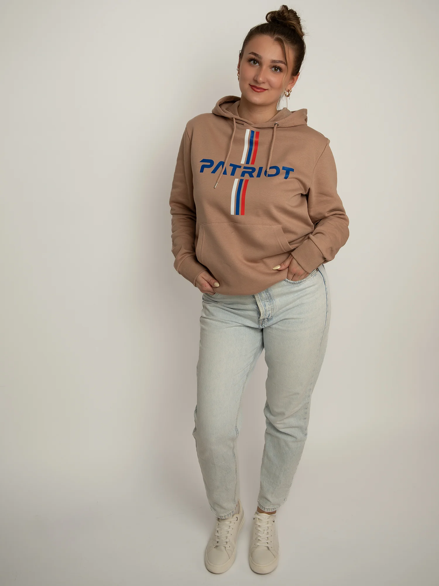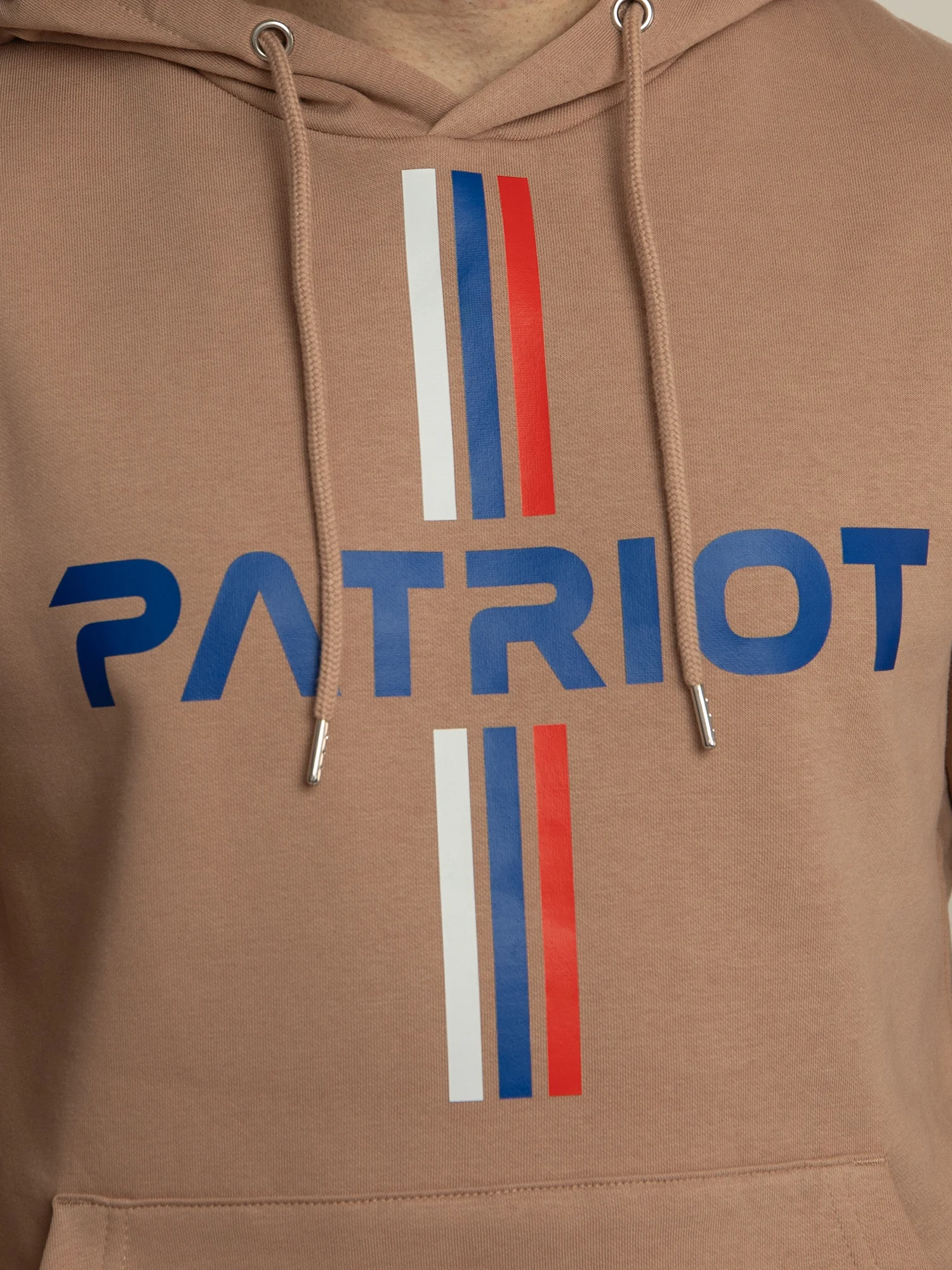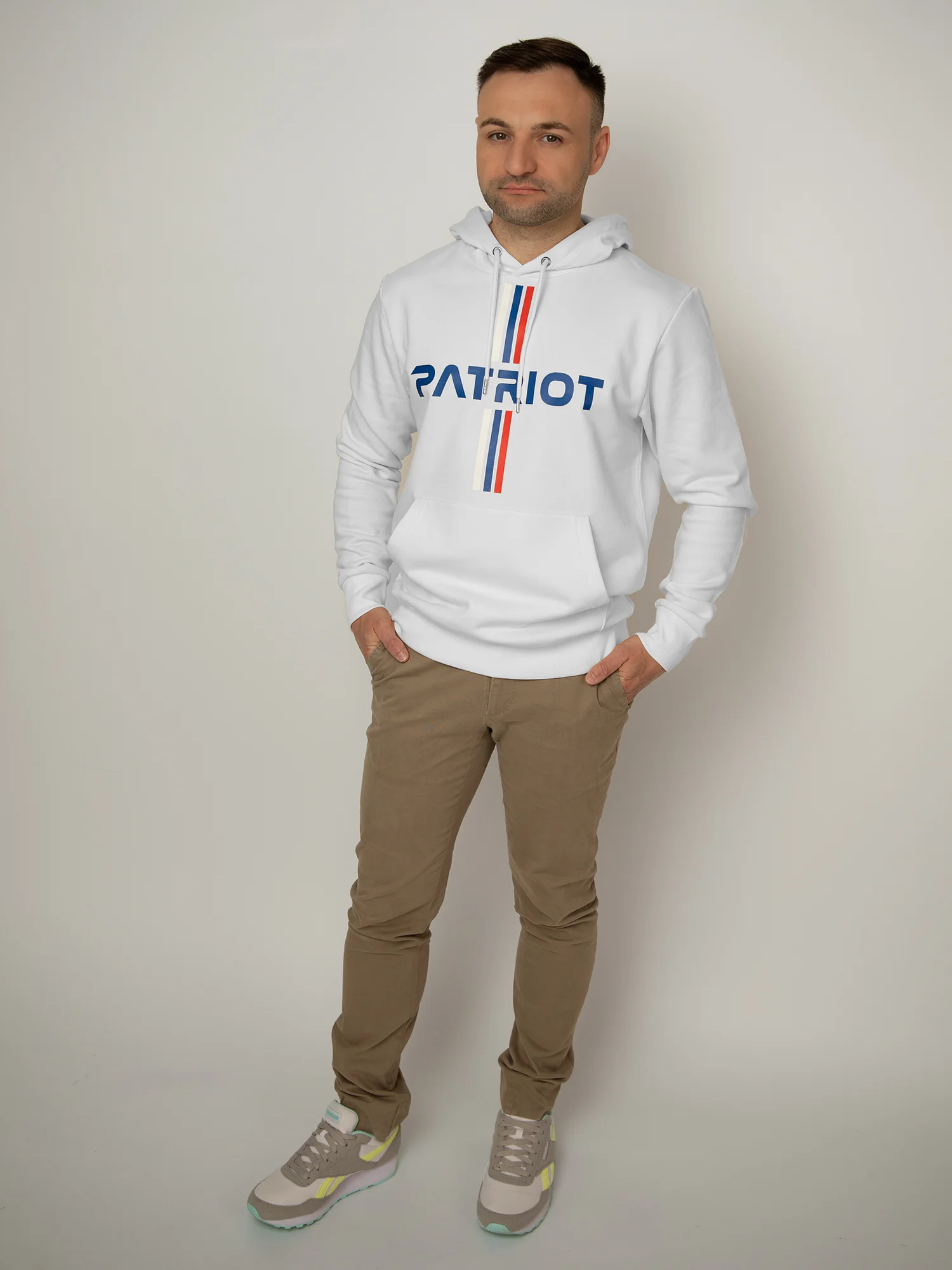 Das Design der Modern Edition zeichnet sich durch den vertikal verlaufenden Streifen in den Farben Blau, Weiß und Rot aus, der mittig über den Brustbereich verläuft. Darüber ist der kräftige „PATRIOT“-Schriftzug platziert, der dem Hoodie einen sportlich-modernen Charakter verleiht. Die klare Linienführung und die harmonische Farbgestaltung machen dieses Modell zu einem markanten Statement-Piece, das sich vielseitig kombinieren lässt.